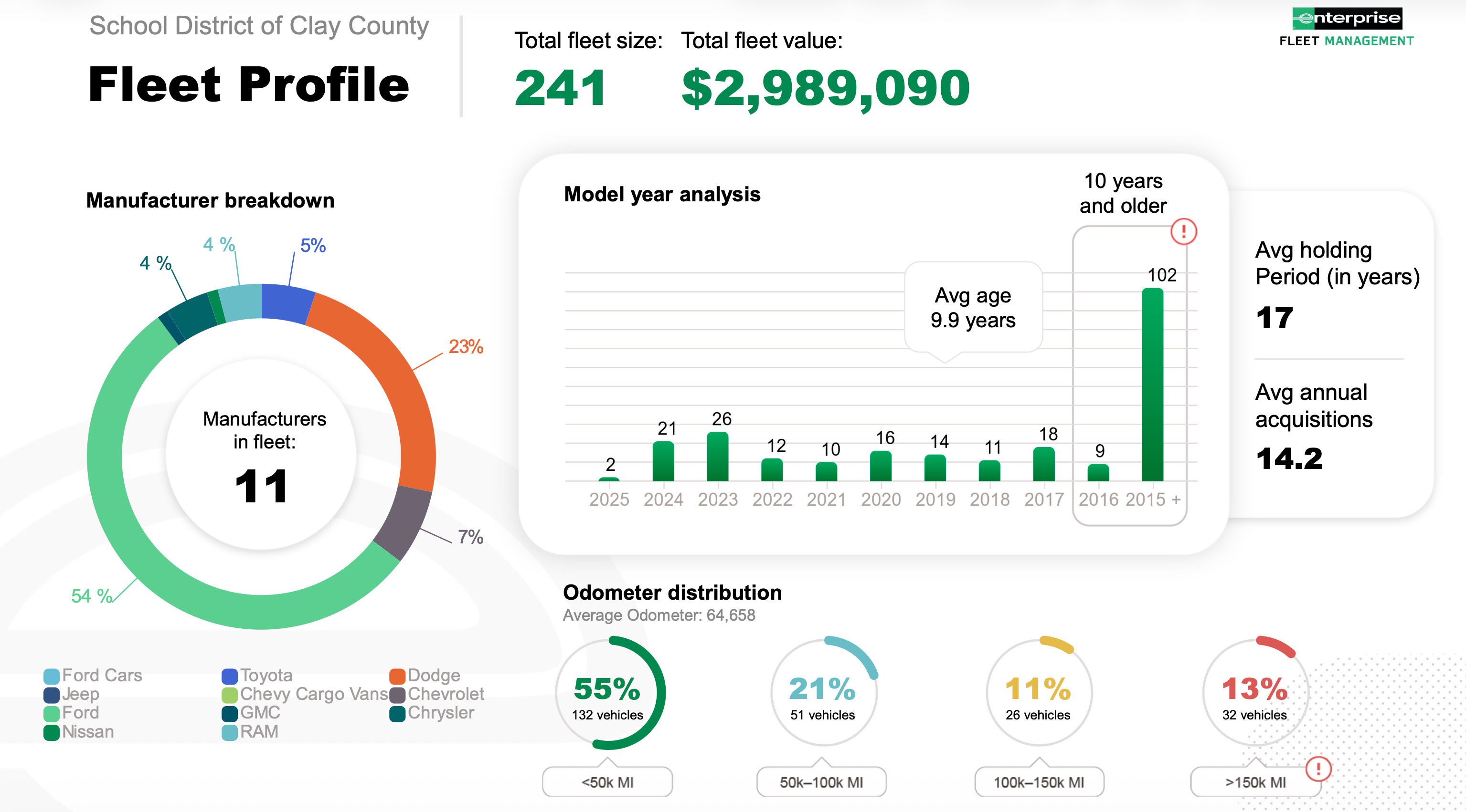 A recent fleet analysis presented by Enterprise Fleet Management (EFM) to the School District of Clay County highlights significant issues with the district's non-bus fleet, dubbed the “White Fleet.”