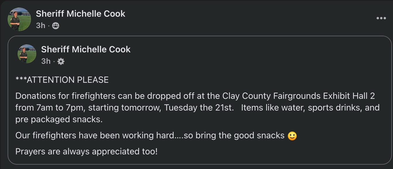 Tomorrow from 7 am to 7 pm, donations of water, sports drinks and snacks can be dropped off. These supplies will do directly to people tasked with putting the fire out.