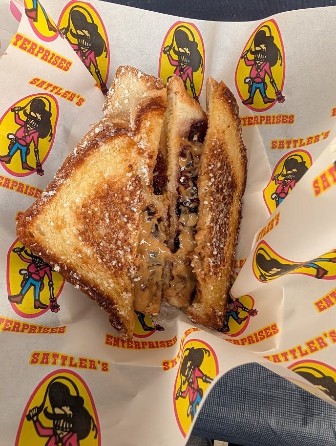 I was really torn on what to have for dinner. There are so many delicious choices at the fair. I was in line for tacos when I turned around, and my eyes saw the words “Loaded Grilled Cheese”. More delicious choices to be made at Sattler’s. I ended up with their Grilled PB&J! I was so good.