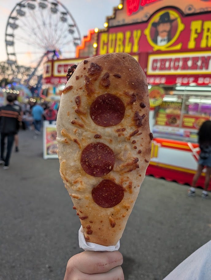 The pizza on a stick was my 14-year-old’s main reason for going to the fair. “It is Yummy!” “Similar to a corn dog”, she warns, “You have to be careful biting around the stick.” It looks plain from the outside. Inside, it is filled with cheese, marinara sauce, and more pepperoni.