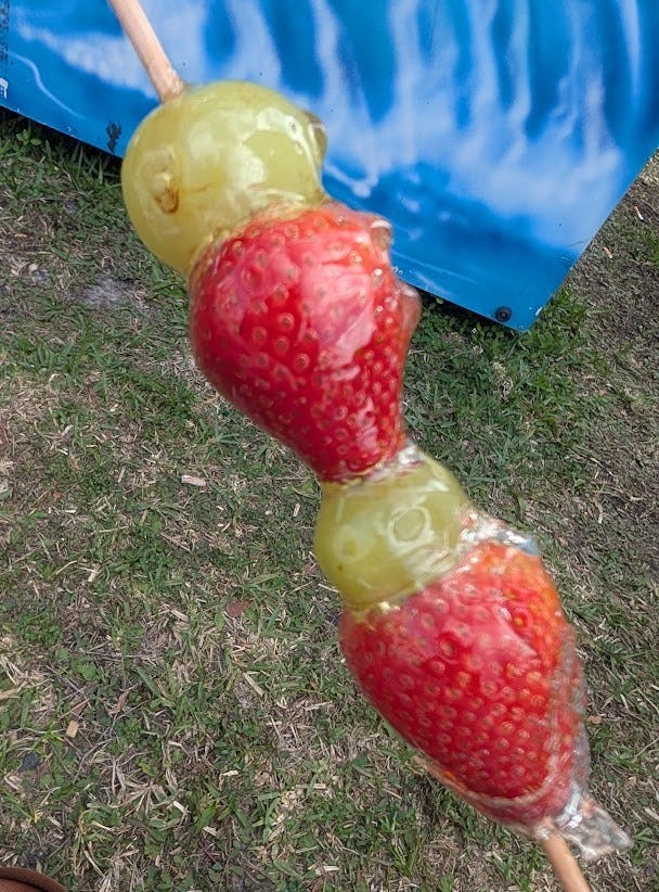 Let’s start with this “new to me” item. Tanghulu is a traditional Chinese street snack of skewered fruits coated in a hard, crunchy sugar glaze. The vendor made this look appetizing by displaying skewered fruits that weren’t even what they were serving.