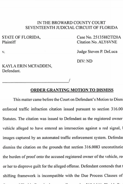 In Florida, traffic citations are administered to the person driving the vehicle. In comparison, red-light camera citations are issued to the vehicle owner, who must either admit they were driving or submit an affidavit to the court naming the driver. Per the judge, this constitutes an illegal attempt by the state to force an accused person to prove their innocence.