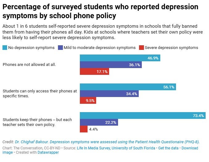 Seventeen percent of kids who attend schools that ban or confiscate phones report severe depression symptoms, compared with just 4% among kids who keep their phones with them during the school day.