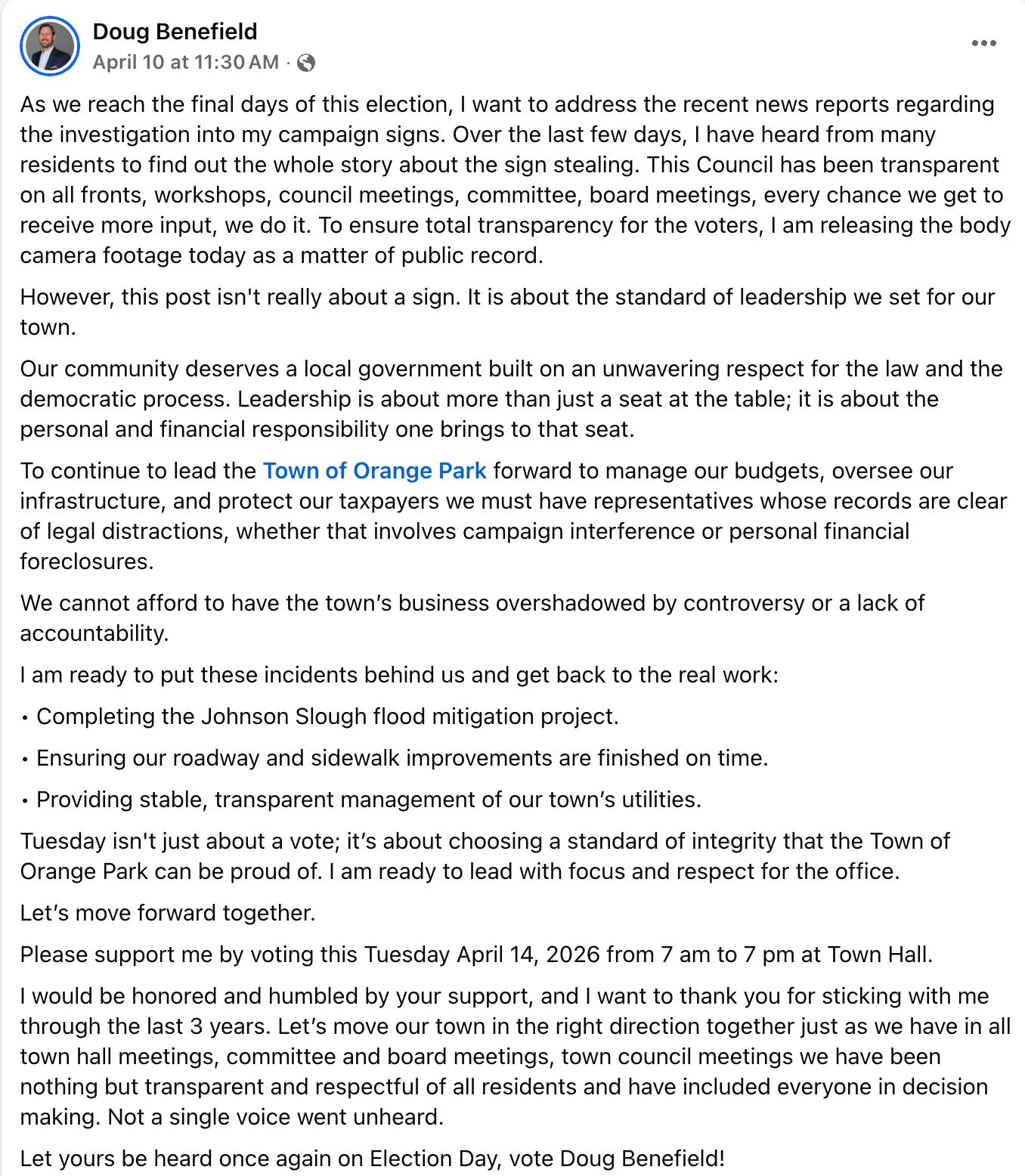 Benefield made sure to publicize the theft and use it to his advantage. On his Facebook page, he wrote about the theft and argued it should be proof that he’s the better choice for Orange Park voters.