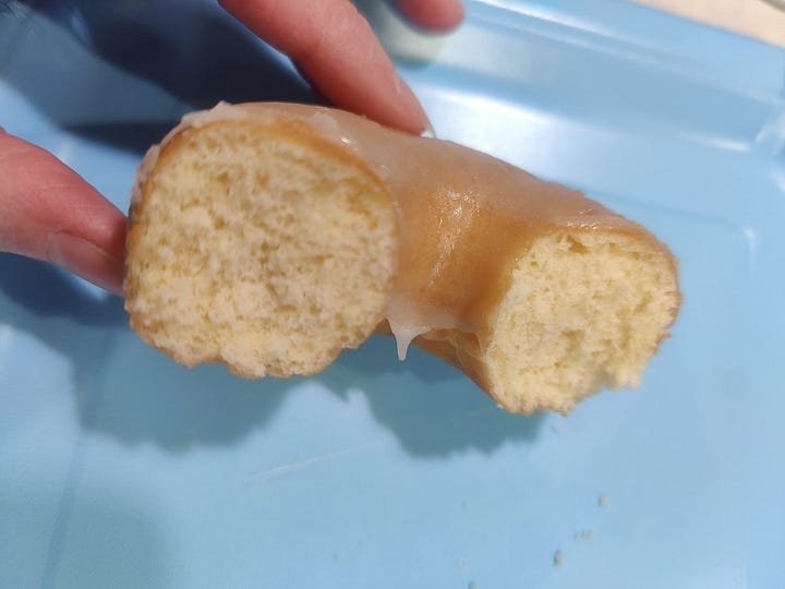 The icing is not too overwhelming. Some icings overpower the donut's flavor. This pairs very well, and you can taste both the donut and the icing. It barely has the crackle of a Krispy Kreme donut.