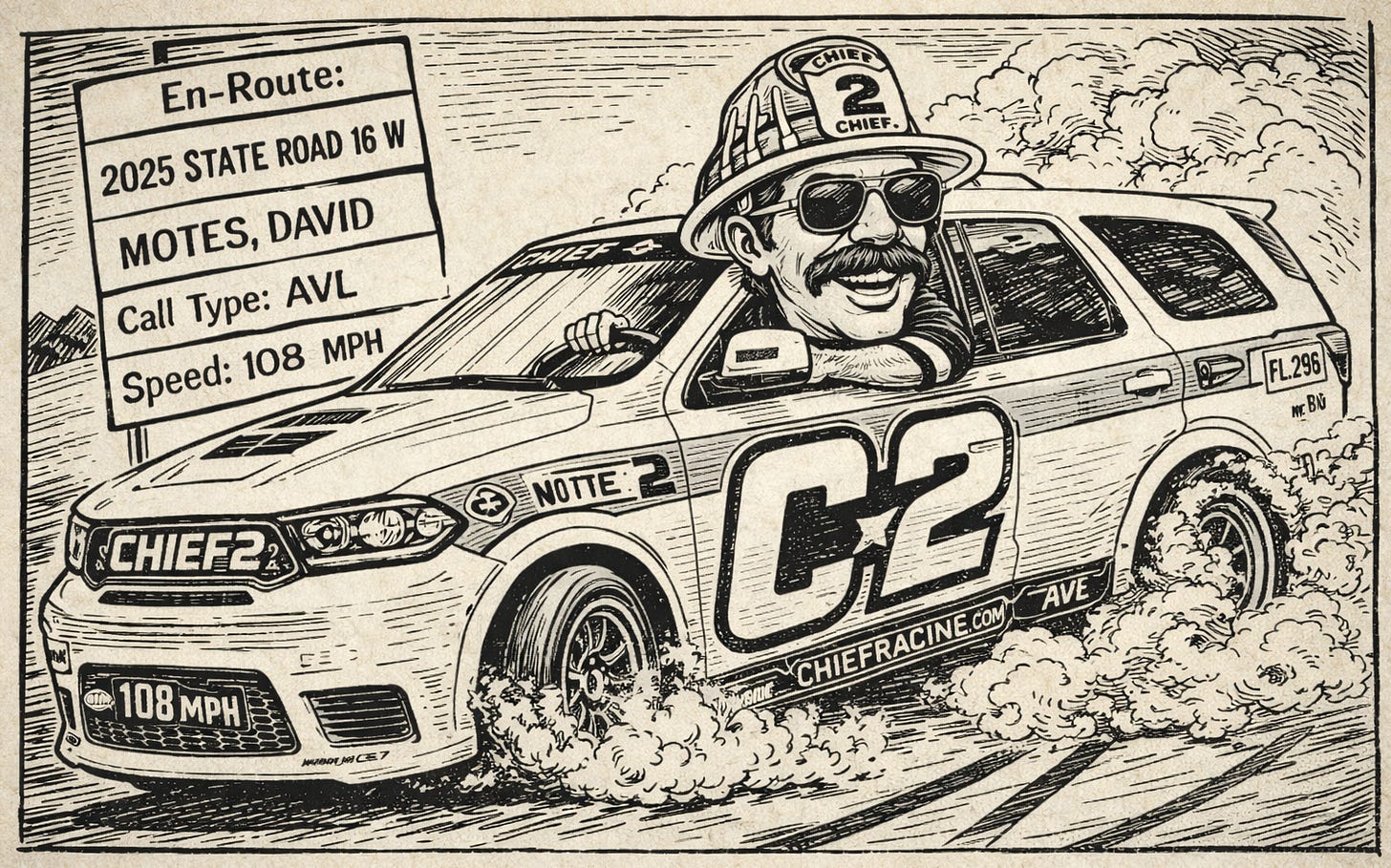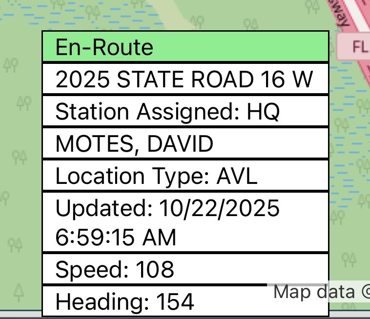 Watching his driving habits, some folks swear Motes is most likely practicing for the Daytona 500. They may be on to something. The other time he successfully managed to engage his locator was on October 22, 2025, when he was heading to a car accident on Highway 16 in Green Cove Springs. His AVL showed he was driving 108 miles-per-hour.