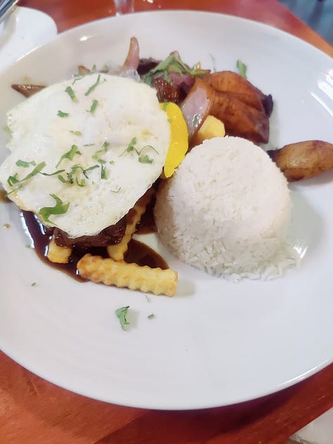 Lomo A lo Pabre - tenderloin, onions, tomatoes, fries, 2 fried eggs and sweet plantains and rice. This was my husbands dish. He doesn’t do tomatoes. He said it was lacking something as well. His dish seemed like it needed more sauce.
