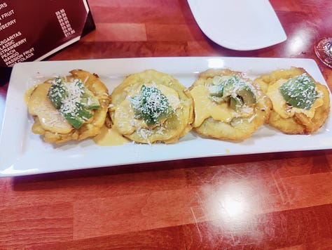 Here is what we ordered: Tostones A La Huancaina - mashed green plantains fried with huancaina sauce, avocado and cheese (sprinkled for garnish). They were good but plain. I think the sauce needed something more like salt.