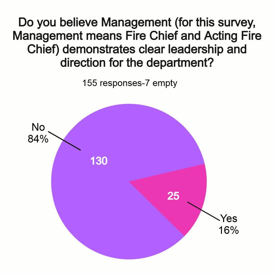 Both surveys included questions about management. The county’s 2025 survey asked whether Fire Chief/Deputy County Manager Lorin Mock and Acting Fire Chief/Assistant County Manager David Motes showed clear leadership—84 percent said no.